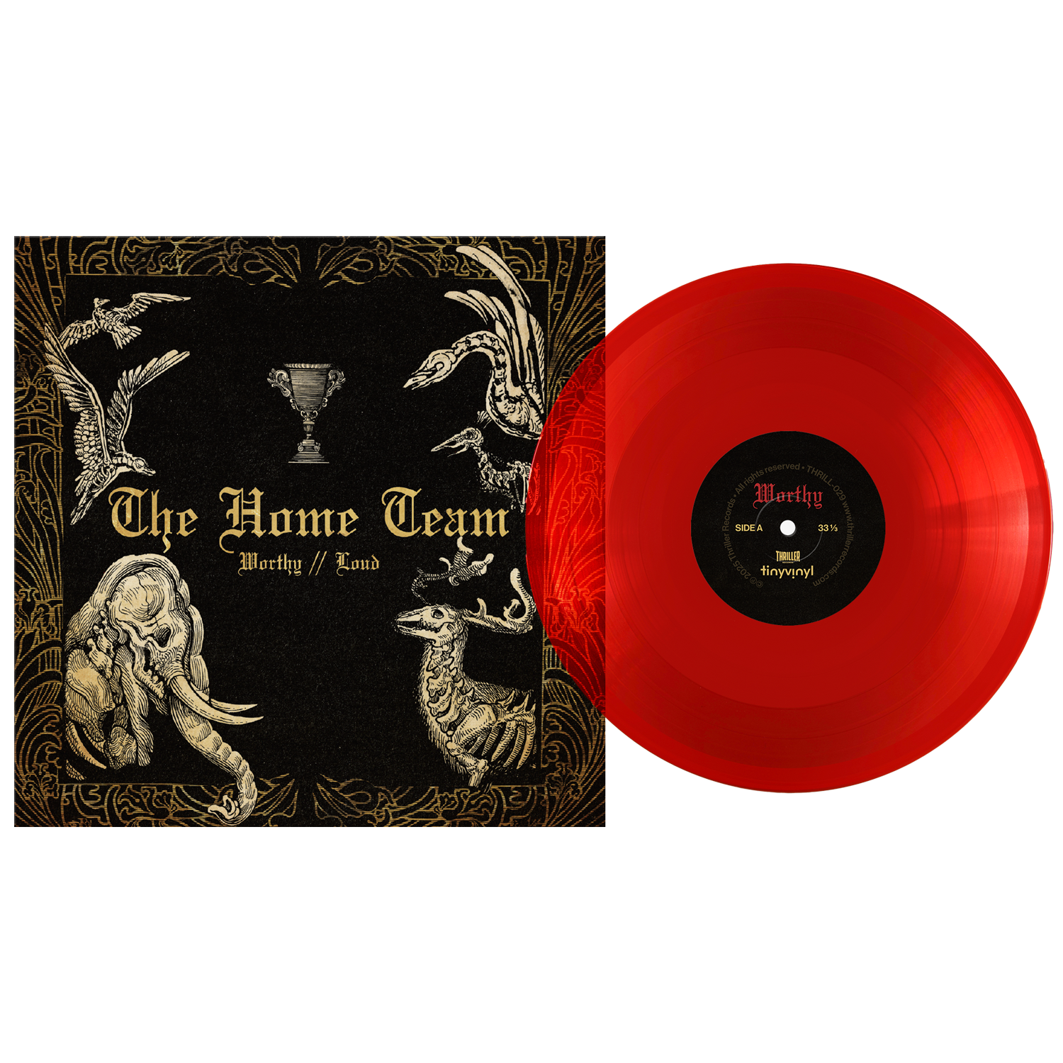 A translucent red sustainable vinyl record by The Home Team is partially out of its black and gold cover, which displays “The Home Team - Worthy // Lord” with ornate animal and trophy illustrations.